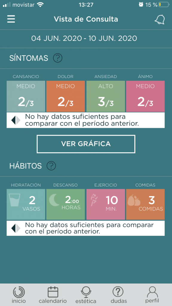 ● Diana te acompaña. La sección de «vista de consulta» genera un informe detallado de tu actividad y estado para que no olvides nada en tus consultas clínicas.